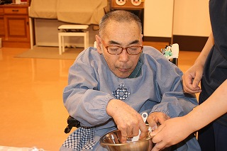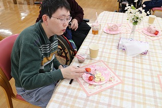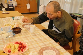 6月のぴあっとはカロリーを気にせず食べられるよう、ライスペーパーでフルーツ大福を作りました!いつもと違う食感にやや不思議な様子がありましたが楽しく作ることができました。