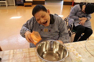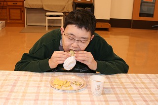 11月のぴあっとは旬のさつま芋を使ったおにまんじゅう。蒸しあがったアツアツのさつま芋を食べて、身体もこころもあたたまりました。