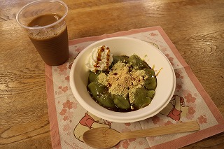 新茶が出始めた5月のぴあっとは抹茶を使った「わらび餅風」。熱を加えながら練る作業はとても大変でしたが、旬の抹茶と抹茶豆乳を使ったわらび餅風はお茶のいい香りがしました。その上にきなこや黒蜜、ホイップクリームなど好みのトッピングをして楽しみました。