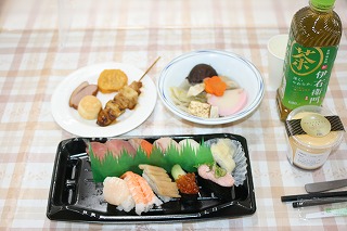 メニューは寿司orうな重、寄せ鍋、オードブル、プリン、飲み物はノンアルコールビールやジュース、お茶などのみたい物を選んでもらいました。