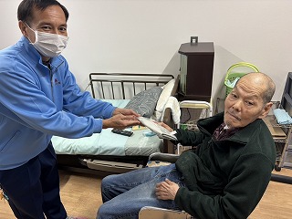 グレイスホームでは食堂のテレビを使用してオンラインで参加しました!クリスマスプレゼントには名前の入ったトートバックを貰いました。
